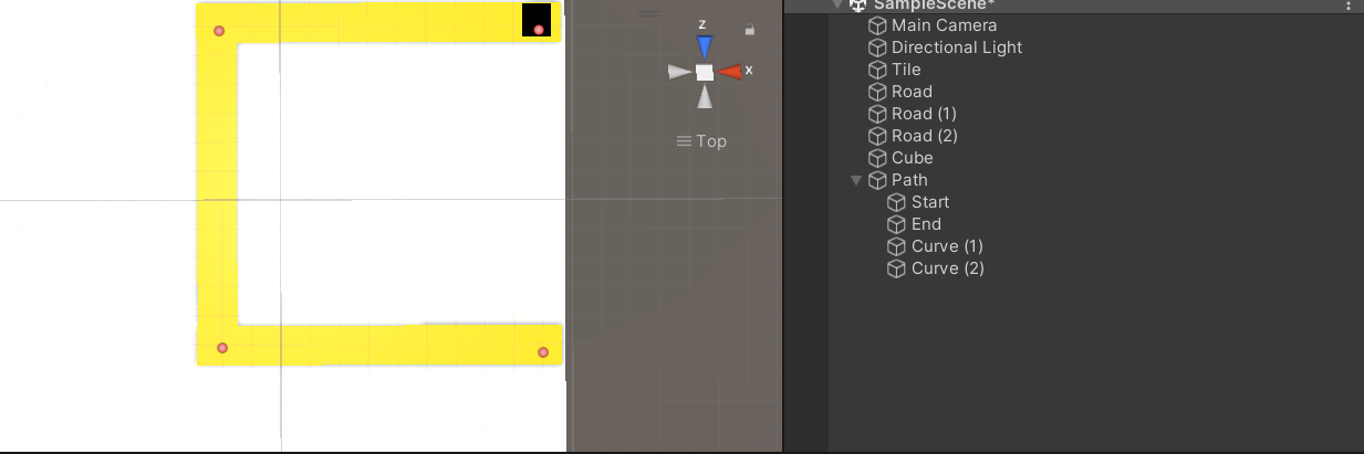 검은색 큐브가 있는 지점을 Start로 해서 Curve (1), Curve (2)를 지나 End에 도달하게 오브젝트를 생성해놨다.